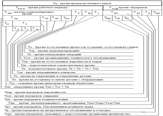 Время перерывов (Твпр) обусловлено режимом труда (Трт), межоперационным пролеживанием детали (Тмо), временем перерывов на межремонтное обслуживание и осмотры оборудования (Тр) и временем перерывов, связанных с недостатками организации производства (Торг):