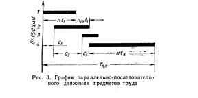 Необходимость выравнивания (синхронизации) длительности отдельных операций существенно ограничивает возможность широкого применения параллельного вида движения, что способствует применению третьего – параллельно-последовательного вида движения предметов труда.