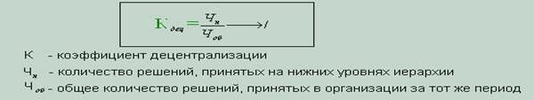 Для измерения степени децентрализации используется коэффициент децентрализации как отношение числа решений, принятых на нижних уровнях иерархии к общему числу решений, принятых в организации. Чем ближе значение коэффициента к 1. тем выше степень децентрализации.