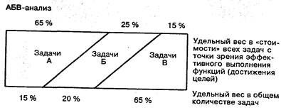Техника анализа АБВ исходит из имеющегося опыта, согласно которому доли в процентах более важных и менее важных дел во всем их общем количестве остаются в целом неизменными. С помощью букв А, Б и В отдельные задачи подразделяются на три класса, а именно в соответствии с их значимостью с точки зрения достижения профессиональных и личных целей.
