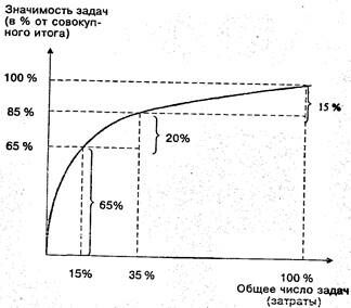 — Важнейшие задачи (категория А) составляют примерно 15 % количества всех задач и дел, которыми занят руководитель. Собственная значимость этих задач (в смысле вклада в достижение цели) составляет, однако, примерно 65 %.
