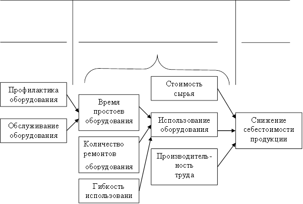 Рассмотренный пример позволяет проследить последовательность построения причинно-следственной цепочки от движущих факторов и функциональных показателей до конечного целевого показателя (на примере снижения себестоимости продукции).