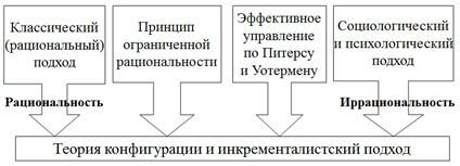 Синтезом всех представленных подходов стали предложенные в работах Минцберга, Квинна и других ученых теория конфигураций и инкременталистский подход к принятию решений. Согласно такому «синтетическому» подходу принятие решений – это не одномоментное действие, а долгий процесс, осуществляемый шаг за шагом. В ходе его руководитель часто советуется со своими сотрудниками, иногда намеренно затягивая стадию обсуждения, чтобы добиться поддержки и собрать нужные сведения, использует специально подготовленную и случайную информацию. Планирование действий и сами действия могут идти параллельно. После накопления «критической массы» исходного материала принятие решения происходит скачкообразно: как переход из одного качественного состояния в другое.