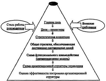 Следующий этап организационного проектирования – создание организационной структуры. Основой для разработки организационной структуры служит общая схема функционального взаимодействия предполагаемых подразделений (организационная модель). Эта модель формируется на базе организационной концепции, во многом зависящей от стиля работы руководителя. При этом должен учитываться опыт работы других организаций и внешние требования, предъявляемые к вновь создаваемой организации.