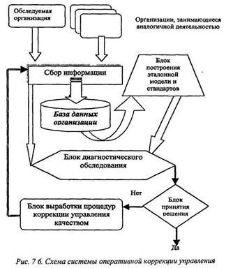 В блоке принятия решения по выявленным значениям отклонений от эталонной модели делается вывод об удовлетворительной эффективности работы обследуемой организации или о необходимости проведения процедур оперативной коррекции системы управления организацией. В последнем случае производится разработка методов коррекции системы управления. На этом этапе также целесообразно прислушаться к мнению представителей консалтинговых фирм и менеджеров сторонних организаций.