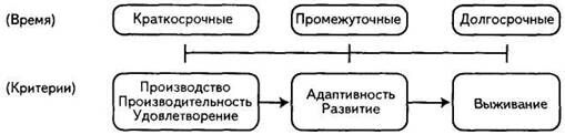 Введение фактора времени позволяет говорить об эффективности в кратко-, средне- и долгосрочной перспективе. Например, можно оценивать определенную организацию как эффективную с точки зрения таких показателей, как уровень производства, удовлетворение и производительность, но как неэффективную в показателях адаптивности и развития. Производитель определенной продукции может быть очень результативен в краткосрочной перспективе, но у него может быть мало шансов на выживание. Таким образом, когда речь идет об оптимальном балансе, то имеется в виду и сбалансированность деятельности организации во времени.