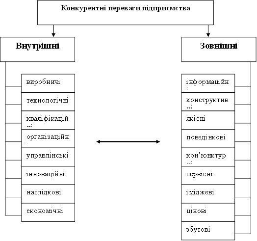 Конкурентные преимущества предприятия по источникам их возникновения можно разделить на внутренних и внешних. Внутренние — это характеристики внутренних аспектов деятельности предприятия (уровень затрат, производительность труда, организация процессов, система менеджмента, и тому подобное), которые превышают аналогичные характеристики приоритетных конкурентов.