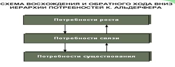 Однако, в отличие от теории А. Маслоу, К. Альдерфер считает, что движение идет в обе стороны: наверх, если не удовлетворена потребность нижнего уровня, и вниз, если не удовлетворяется потребность более высокого уровня.