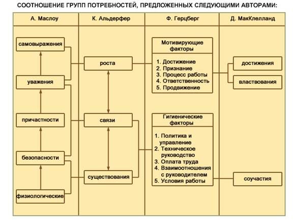 Группы потребностей, предложенные разными авторами содержательных теорий, достаточно наглядно между собой соотносятся.
