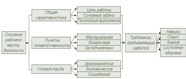 Т.о. описание рабочего места (должности) предполагает анализ основных должностных обязанностей сотрудника, технологии выполнения работы, эргономических, экономических и социальных условий труда. В результате анализа должны быть сформулированы требования к профессиональным знаниям, навыкам, опыту, кандидата.