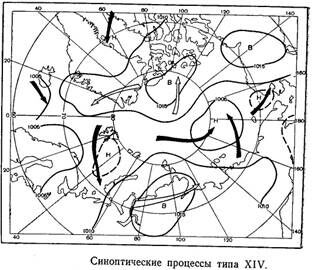 Группа В охватывает такие процессы, при которых в западных районах Арктики наблюдается циклоническое поле, а в восточных — антициклоническое (типы VI—X).