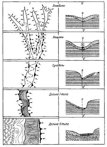 Когда рассматривается система постоянно и временно действующих водотоков, применяется термин русловая сеть. Часть русловой сети, включающая достаточно крупные, преимущественно постоянные русловые потоки, объединяется понятием речной сети. В строении гидрографической (русловой) сети можно выделить следующие основные звенья, последовательно сменяющиеся от верховьев вниз по течению: ложбины, лощины, суходолы, речные долины (Рис. 1).