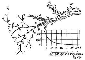 а — схема речной системы; б — зависимость относительной глубины (h/В) от порядка потока (N) и среднего годового расхода (Q0). I-VIII — порядки естественных потоков.