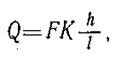 где Q — количество воды в м3/с, протекающей в единицу времени через данное поперечное сечение породы площадью F м2; К — некоторая величина, называемая коэффициентом водопроводимости или коэффициентом фильтрации; h — напор; l — длина пути фильтрационного потока в метрах.