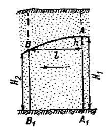 Величина напора определяется по разности уровней в двух сечениях потока, т. е. h = H1 - H2, где H1 и H2 — высота уровней в точках А и В. Под влиянием напора вода из сечения АА1 перемещается в направлении сечения BB1.