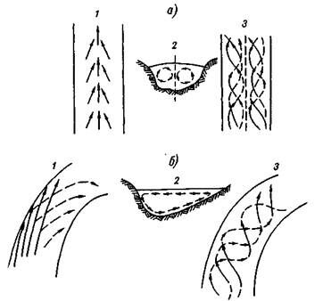 На стрежне вследствие больших скоростей на поверхности воды происходит втягивание струй со стороны, в результате в центре потока создается некоторое повышение уровня. Вследствие этого в плоскости, перпендикулярной направлению течения, образуются два циркуляционых течения по замкнутым контурам, расходящиеся у дна (рис. 7а). В сочетании с поступательным движением эти поперечные циркуляционные течения приобретают форму винтообразных движений. Поверхностное течение, направленное к стрежню - сбойное, а донное расходящееся — веерообразное.
