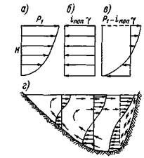 У поверхности она больше, у дна меньше вследствие уменьшения с глубиной продольной скорости (рис. 8а). При перекосе водной поверхности возникает избыточное давление iпопg. где g — вес единицы объема воды; iпоп — поперечный уклон. Оно одинаково для каждой точки вертикали и направлено в противоположную сторону по отношению к центробежной силе инерции (рис. 8б, в). Вследствие неуравновешенности этих сил в отдельных точках по вертикали и возникает в потоке поперечная циркуляция (рис. 8г).