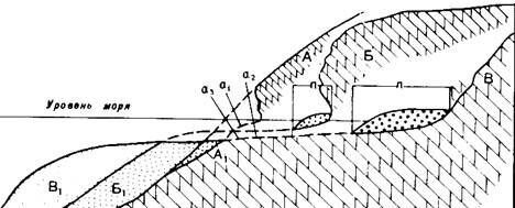 а1- a3- различные положения абразионных террас; А, Б, В - различные положения отступающего берегового склона, абрадируемого морем; пунктиром показаны абразионные террасы, соответствующие различным стадиям развития берега; A1,, Б1, В1 - различные стадии развития подводной аккумулятивной террасы; П - пляж