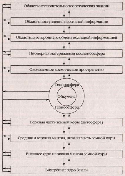 Локализация населения в населенных пунктах, городах, агломерациях и мегалополисах приводит к аккумулированию социомассы, информации и энергии, делает их ядрами социально-географических полей, вокруг которых формируется тяготеющая к ним периферия. В местах наименьшего тяготения наблюдается пониженный массо- и энергообмен, что учитывается при проведении условных границ полей. Эти границы носят прозрачный и расплывчатый характер и поэтому не препятствуют протеканию ноосферных, социальных, экономических, энергетических, информационных и других процессов. Между полями существуют мощные силы притяжения и отталкивания, которые формируют массовые материальные, духовные, политические и коммуникационные взаимосвязи. Разнообразные и интенсивные энерговещественные потоки пронизывают социально-географическое пространство и взаимодействуют с геологическим и космическим пространствами. Эти взаимодействия обусловлены проникновением человека как в литосферу (шахты, карьеры, буровые скважины и др.), так и в космос. Одновременно геологическое и космическое пространства изменяют параметры и свойства территориальных общественных систем, непрерывно обеспечивая их «средствами к существованию» — веществом, энергией, информацией. По степени, характеру и интенсивности этого взаимодействия в ноосфере выделяются следующие структурные уровни, или области (рис. 1).