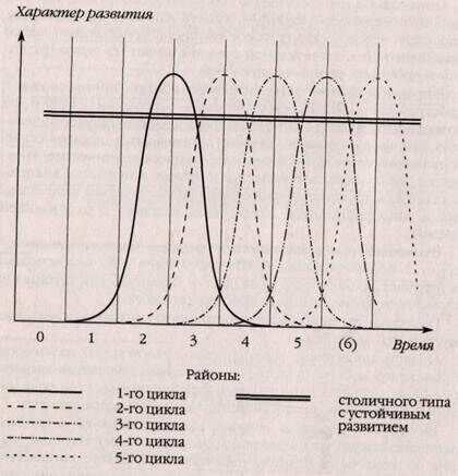 Рис. 2. Динамика районов разного типа в ходе больших социально-географических циклов Н. Д. Кондратьева (по В. Л. Бабурину)