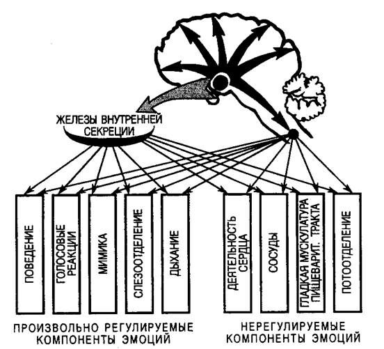Периферические компоненты эмоции можно подразделить на произвольно управляемые и неуправляемые. К частично управляемым относятся движения, мимика, речь, дыхание. К неуправляемым – деятельность сердца, гладкой мускулатуры сосудов, кишечника, желез внутренней секреции.