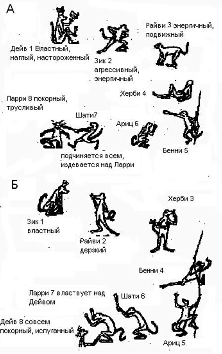 Результаты эксперимента К. Прибрама: иерархия господства в колонии из 8 обезьян до (А) и после (Б) двустороннего удаления миндалины у Дейва, в результате которой он переместился на самую низшую ступень иерархической лестницы.