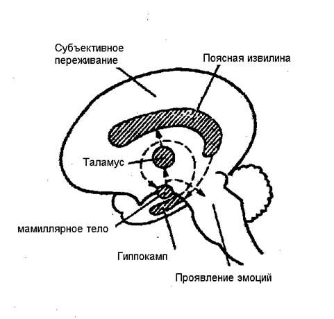 В соответствии с теорией И. Пейпеца возникновение эмоций связано с лимбической системой. Возбуждение распространяется по структурам, входящим в «круг Пейпеца». В гиппокампе возникает возбуждение, оттуда импульсы идут в мамиллярные (mamilllaris) тела, затем в передние ядра гипоталамуса и в поясную извилину и распространяются на другие области коры (рис 18). Такая циркуляция приводит к значительному усилению эмоций, и даже может придавать им затяжной, патологический характер. Эмоции возникают либо сначала в коре, откуда импульсы поступают в "круг" через гиппокамп, либо через гипоталамус и тогда кору поясной извилины следует рассматривать как воспринимающую область для эмоциональных ощущений. Распространение эмоционального возбуждения с поясной извилины в кору больших полушарий создает, по мнению автора, ту эмоциональную окраску, которая воспринимается субъективно.