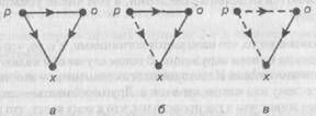 Рис. 4.25. Из трех триад две - а и в - сбалансированы, б не сбалансирована. Стрелками показаны направления отношений: сплошными - позитивных, прерывистыми – негативных