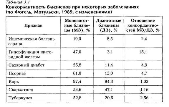 Значительные отличия в конкордантности у моно- и дизиготных близнецов указывают на большую роль генетических факторов, определяющих подверженность ряду заболеваний (см., например, данные по диабету).