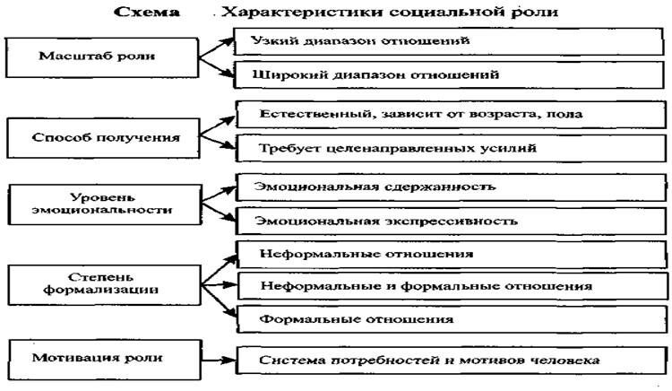 Основные характеристики социальной роли выделил американский социолог Т. Парсонс. К ним относятся: масштаб роли, способ ее получения, уровень эмоциональности, степень формализации, мотивация .