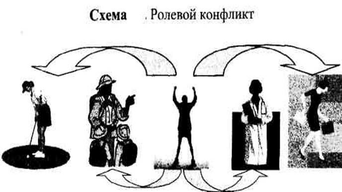 Человеку приходится быть в различных ролях, и он физически не может отвечать всем предписываемым ими требованиям. В этом случае может возникнуть ролевой конфликт (схема 19).