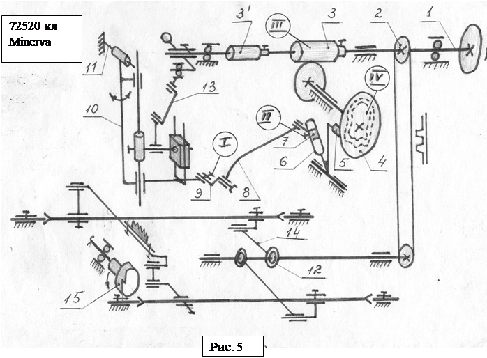 §5 Совместная схема механизмов иглы, отклонения иглы и подачи материала машины класса 72530 Minerva