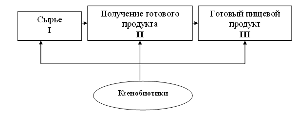 Безопасность пищевого продукта – это показатель, зависящий от присутствия возможных ксенобиотиков, содержавшихся ранее в сырье (I), соединений, образовавшихся под влиянием ряда факторов в ходе технологического потока (II) или специально внесенных при его получении (II, III) (рис. 2).