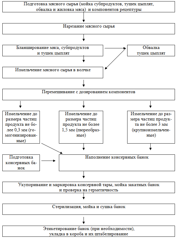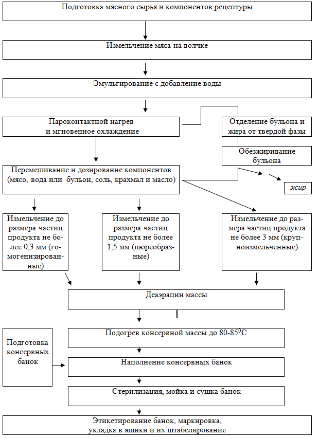 Из ассортимента крупноизмельченных и пюреобразных консервов наибольший удельный вес составляют консервы «Пюре мясное детское», технологическая схема (4) которых имеет некоторые отличия от вышеописанной.