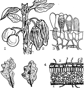 | Кармашки слив 1 - здоровые плоды; 2 - пораженные плоды; 3 - сумки и аскоспоры Мучнистая роса: слева - проявление болезни на листьях дуба;справа - схема развития мучнисторосяного гриба. Мицелий (I) и конидиальное спороношение (2,3) развиваются на поверхности ткани; внутрь субстрата.в эпидермальные клетки, заходят только гаустории (4) |