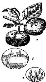 | Парша яблони: а) пораженный лист и плод яблони б) псевдотеций с сумками, в) конидиеносцы с конидиями