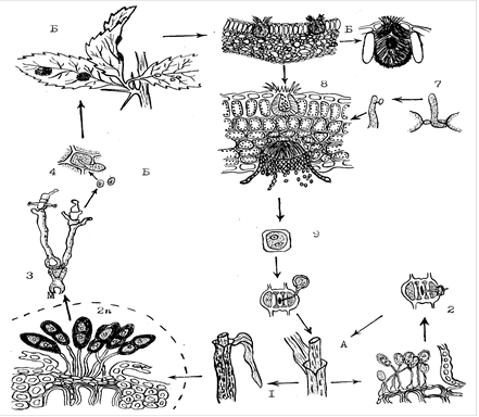 1 - листья и стебли злака, пораженного пукцинией; 2 - урединиоспоры и их прорастание; 3 - телиоспоры и их прорастание; 4 - базидиоспоры; 5 - листья барбариса, пораженные пукцинией; 6 - лист барбариса с пикнидами;7 - образование дикарионного мицелия; 8 - лист барбариса с эциями; 9 - эциоспора и ее прорастание