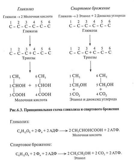 Оба эти процесса включают окислительно-восстановительные реакции. Об этом отчетливо свидетельствуют конечные продукты спиртового брожения; этанол можно рассматривать как относительно восстановленное соединение, т.к. его молекула содержит определенное количество водорода, а диоксид углерода — как относительно окисленное, поскольку водород в его молекуле отсутствует. В конечных продуктах гликолиза окислительно-восстановительный процесс не столь очевиден. Однако один конец молекулы молочной кислоты (метильная группа) находится в более восстановленном состоянии, чем другой ее конец (карбоксильная группа). В молекуле глюкозы атомы водорода распределены более равномерно.
