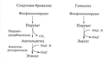 Для организмов, подобных дрожжам, сбраживающим глюкозу до спирта и С02, а не до молочной кислоты, процесс брожения совпадает с гликолизом во всем, за исключением концевого этапа, катализируемого лактатдегидрогеназой. При спиртовом брожении этот процесс заменен двумя другими ферментативными реакциями, катализируемыми соответственно пируватдекарбосилазой и алкоголъдегидрогеназой.