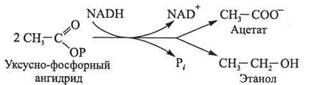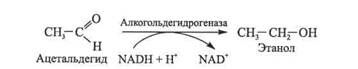 В заключительной стадии процесс спиртового брожения аце-тальдегид восстанавливается до этанола под действием фермента алкогольдегидрогеназы; при этом роль восстановителя играет HADH + Н+: