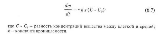 В основе проникновения вещества в клетку лежит процесс диффузии, математическую трактовку которого дал Фик (1955). По закону Фика, скорость диффузии dm/dt прямо пропорциональна градиенту концентрации dc/dx и площади поверхности s, через которую осуществляется диффузия: