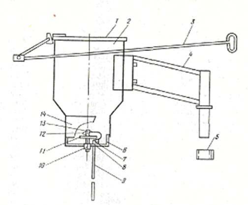 /-крышка; 2 - бункер; 3 - тяга д.™ открывания крышки- 4 - кронштейн. 5 - опорный стакан; <?-поперечина; 7-винт; 8- шаровая опора; 9- маятник; 10 ~ гайка; »_ столик; 12- петлеобразный сбра еыватель гранул; 13 - оградительный штырь; /4 - влагозащитный кожух