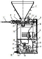 К корпусу прикреплен удлинитель 6 с цевкой 7. Муфта 9 позволяет при необходимости разобрать вытеснитель и приводной вал 8. Для поворота вытеснителя имеется ось 10, установленная в планшайбе. В станине смонтирован электродвигатель, магнитный пускатель 11, концевой 12 и главный 13 выключатель, вакуумный насос 14 с приводом 15 с маслоотделителем 16 на масляной магистрали 17. Педаль 18 служит для включения двигателей 4 и 15. Вакуумный насос откачивает воздух из зоны загрузки через трубу 19. На вакуумной линии установлены вакууметр 20 и дросселирующий клапан 21, позволяющий менять глубину разрежения в системе. Отстаточное давление при вакуумировании составляет 0,08…0,8 МПа.