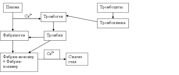 Переход растворимого фибриногена в нерастворимый фибрин.