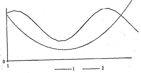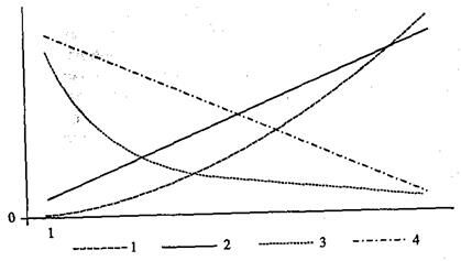 Оказывается, что в ситуации такого рода форм зави­симостей ранговые коэффициенты связи оказываются неэффектив­ными. Действительно, если может оказаться, что для части рес­пондентов, например тех, кто имеет малые значения переменной х (рис. график 1), значение рангового коэффициента связи будет отрицательное, а для тех респондентов, которые имеют большие зна­чения переменной х, значение рангового коэффициента будет поло­жительное, то общее значение рангового коэффициента может ока­заться равным нулю. И это при том, что, как показывает график, связь между переменными явно есть.