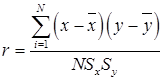 где х и у — средние значения переменных х и у соответственно; Sx и Sy — стандартные отклонения переменных х и у; N — количество наблюдений.