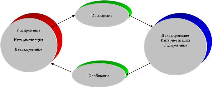 У него схема расположена по кругу и происходит взаимообогащающий обмен информацией, сначала кодирование передача через интернет, декодирование, затем сообщение идет к принимателю, где происходит обратный процесс  (декодирование, интернет, кодирование), тот, в свою очередь, вновь отправляет послание, уже другое.