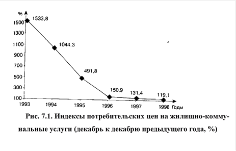 Сочетание параметров жилья и района, где оно расположено, обусловливает колебания цен на рынке жилья. После августовского кризиса цены снизились на 40—41 % (табл. 7.10). В настоящее время в большинстве городов России первая волна перераспределения жилой площади пошла на спад, наступил пери стабилизации, когда ограничение спроса сдерживает рост цен. Развитие ипотечного кредитования привело к оживлению первичного рынка жилья.