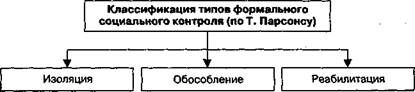 Изоляция. Этот тип социального контроля применяется для отделения закоренелых, наиболее опасных девиантов от общества. Формами изоляции являются предварительное (в камерах предварительного заключения) и тюремное заключение. Такой тип социального контроля позволяет поддерживать высокий статус социальных норм, удаляя их постоянных и злостных нарушителей из общества и лишая негативного примера для тех, кто склонен к девиации. Изоляция, по Т. Парсонсу, не предусматривает попыток реабилитации.