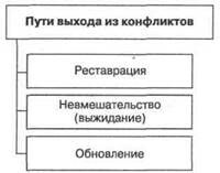 3. Обновление. Это активный выход из конфликта путем отбрасывания, отказа от старого, развития нового. Для реализации этого пути необходимо видеть перспективу, чувствовать рождающееся новое, иметь волю и решимость к изменениям, уметь планировать, выполнять намеченное.